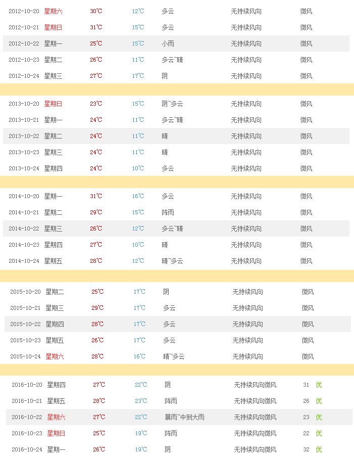 综合近5年的气象数据(见图1),10月22日的气温并不会很冷,在11至28度的区间,天气以晴或多云为主,间或稍稍阵雨,除了去年难得一遇的台风天气以外,都相当舒服,白天温暖早晚清凉。这个时节在浙南都是“乱穿衣”季节,日常可以穿短袖、衬衫、开衫、外套、裙子、长裤、短裤甚至早晚棉衣都有人穿,前往龙泉的时候,在夏装的基础上带一身秋装外衣就够了,比如卫衣、皮肤衣、长袖衬衫、线衫等,日常衣着不需要太厚。但是!划重点!需要注意的是,山上的温度要比这个气象数据普遍低6度以上,在寄存终点的换装包的时候,一定要在里面放一身足够保暖的衣裤备用,因为终点在高山峡谷里,降温很快,会冷很多,宁愿多一点防止感冒。