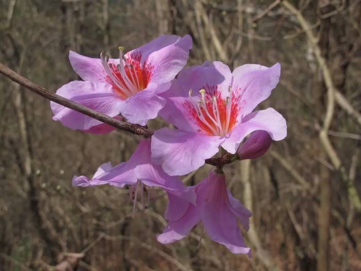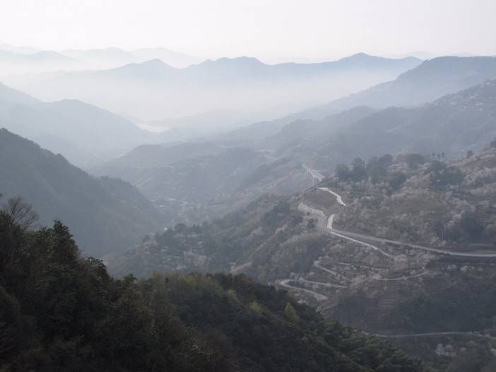 四明山早春时节的一大看点是漫山遍野的野樱花。在低海拔的山区,野樱花通常于2月下旬已有少数开花,3月上旬时逐渐向高山蔓延,到3月20日前后,四明山的高山落叶林中野樱花就大片开放,景象特别壮观。此时的高山落叶林中除了野樱花一派春意盎然之外,其余落叶树种还都处于冬眠状态,因此野樱花成了一群报春鸟,野樱花似乎使四明山的春天来得分外早些。在以商量岗为中心的大片落叶林中,野樱花是群优势种类,这可以在其盛花期得到验证。表明四明山区是野樱花的故乡,同时也告诉我们这一区域为什么特别适合樱花树的生长。