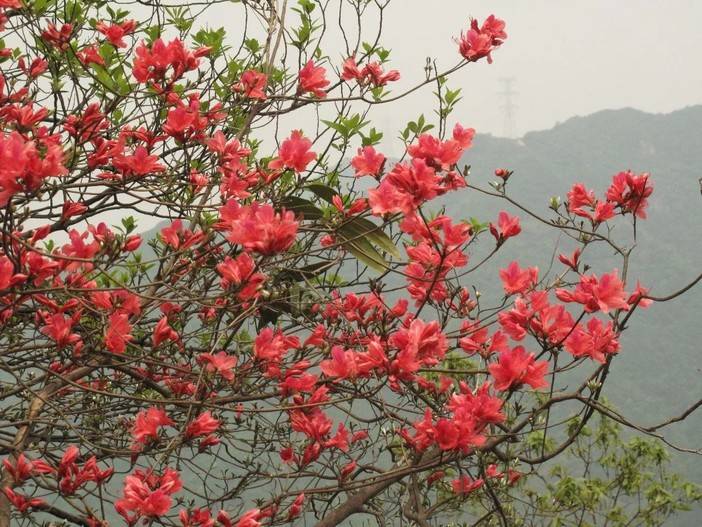 四明山上另有一种颇具特色的杜鹃花种类是云锦杜鹃,又名“天目杜鹃”。有意思的是,据《浙江植物志》记载,云锦杜鹃的模式标本采自鄞县四明山(即现今的海曙区龙观乡百步岗区域)。表明这个杜鹃种类最早是在我们四明山的龙观乡首先被发现并命名的。云锦杜鹃是种典型的高山常绿杜鹃种类,常呈小乔木状且成片生长,叶片宽阔、挺括、光亮,花朵具7个花瓣,花形硕大,比映山红的花朵大数倍,堪称“超级杜鹃”。它的花期在每年的5月初,开花时已有嫩叶长出,花红叶绿,花团锦簇,而且香气袭人,是种很有观赏价值的杜鹃种类。可惜它偏爱高山夏季的凉爽环境,不能抵挡平原地区的盛夏酷暑,我们只能到高山上去欣赏它的花容月貌。