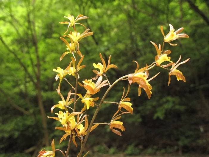 四明山中还有一种叫带唇兰的兰科植物,它是种地生兰,常生长在林下阴湿的岩石或山坡环境中,叶片草质,呈长椭圆状披针形。每年5月1日前后开花,每个花葶上会开出10余朵浅棕色的花朵,唇瓣宽阔,故有“带唇兰”的名字。带唇兰是种分布广但并不常见的珍稀植物种类。