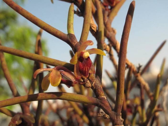 纤叶钗子股也是种附生兰,其叶片纤细呈圆柱形、肉质。多数生长在古树或岩壁上,既耐阴又耐晒,是种比较古怪的兰科植物。5月初开花时,花朵呈黄色夹带着紫色。据《中国植物志》记载,纤叶钗子股的模式标本采自浙江宁波。因此,宁波是该物种最早的发现地,也表明这个物种在宁波是比较多的。国内也只有福建和湖北有分布,这是种珍稀植物种类。