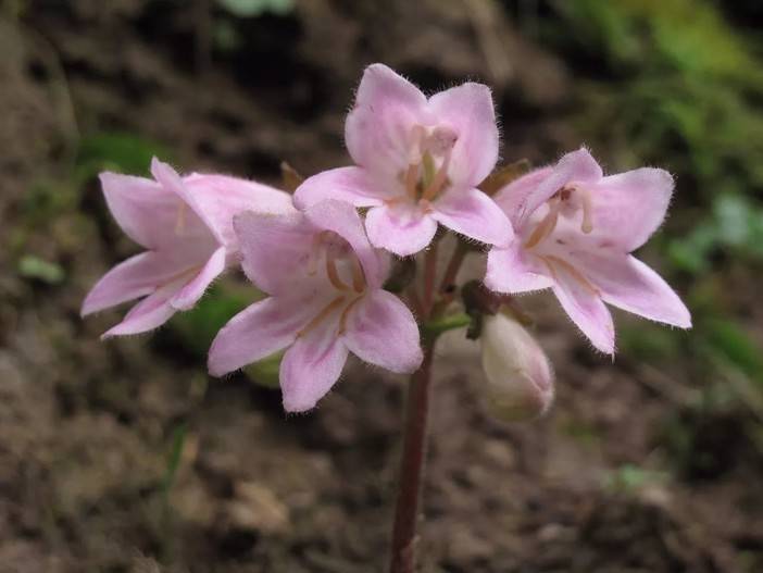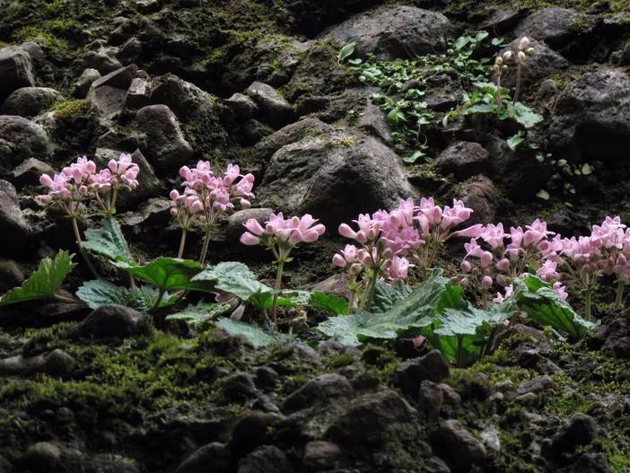 四明山中的苦苣苔科植物共有5种:吊石苣苔(石吊兰)、旋蒴苣苔、大花旋蒴苣苔、半蒴苣苔和红花温州长蒴苣苔。它们的花朵都很好看,而且都只生长在崖壁、岩石或树杆上。其中红花温州长蒴苣苔的花朵大又呈粉红色,叶片宽阔,是这个科中颜值最高的种类,属于“美丽的仙草”,多数生长在“宁波丹霞”比较阴湿的崖壁环境中,花期在5月份。