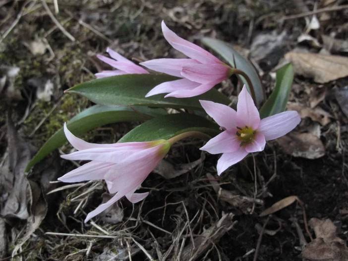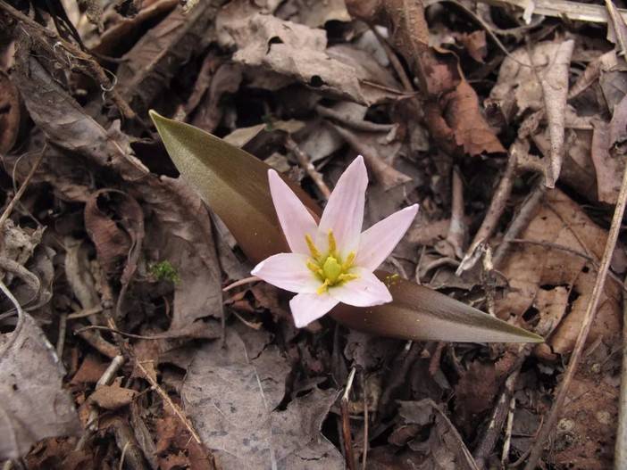 四明山高山上早春开花的植物中还有一种还必须特别介绍一下,那就是百合科的宽叶老鸦瓣,因为据《浙江植物志》记载,它的模式标本就采自宁波四明山。宽叶老鸦瓣的另一个名字叫“二叶郁金香”,也可以说是我们四明山中野生品种的郁金香,是引种培育驯化的好材料。宽叶老鸦瓣在国内除了本省,只有安徽省有分布,省内也只有天台和临海有分布,为我国特有物种,不像其同属相近种类老鸦瓣,后者在我国的大江南北、朝鲜、日本均有分布。因此,宽叶老鸦瓣是种四明山上不可多得的珍稀观花植物种类。