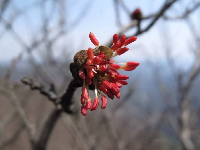 银缕梅是国家一级重点保护植物(金缕梅科),雌蕊成熟时时已有叶片长出