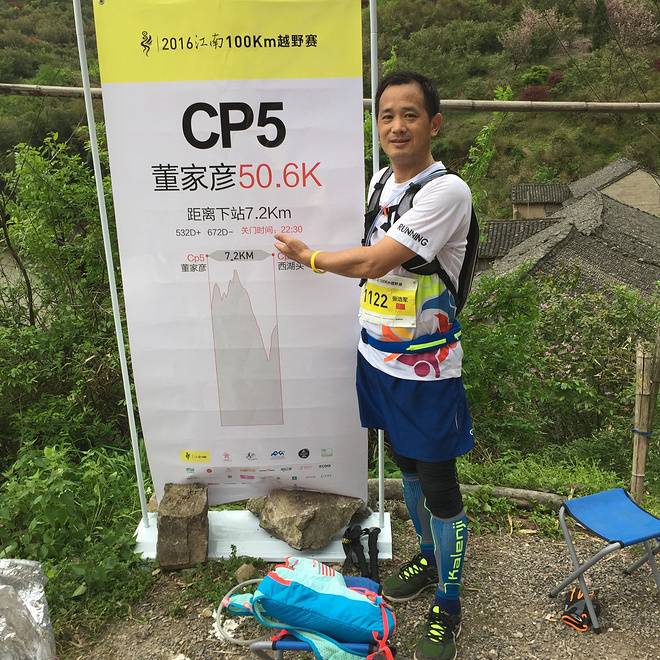 “2015西部越野,暴雪中被关,录止于33/45;2016江南100,暴雨中被停赛,记录止于52.5/60。