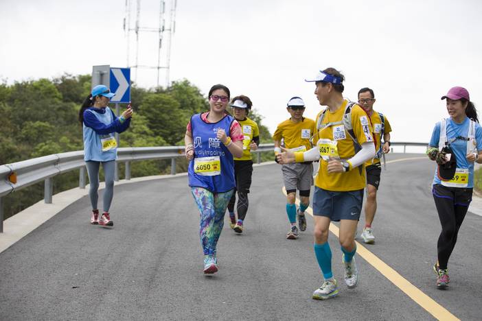 "跑越野实际上是很危险的,尤其是对我这种完全没有赛场经验的参赛者来说。上山时由于对前方路况的不熟悉,加上持续陡峭的上坡我一度觉得喘不上气。这时正好遇上了金基镐先生,他们看到我们一行三个女生挑战越野,主动提出轮换来陪我,顺便传递一下陪跑经验。