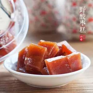 以野生植物-酸枣为原料,经果物保鲜,脱皮去核,加入蔗糖,铜锅浓缩,自然风干,精制成酸枣糕。酸枣糕,色泽透明,美似琥珀,酸甜可口,营养丰富。以天然野酸枣为原料精制而成,含鲜果固有的维生素、氨基酸、微量元素等营养成份,嫩糯细腻,口感较好。