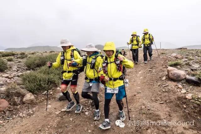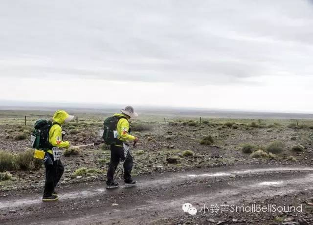 在CP2的时候我预计到按照我们现在的速度到cp3的时间很紧张,因为前面这段路也不好走,有很多上坡下坡,于是我告诉王琦我们需要稍微赶一下路。出了CP2一会雨就开始下起来,气温一下子低了很多,我们赶快把冲锋衣拿出来穿上,走了会感觉拉着绳子的手露在外面冻僵了,我就想办法把绳子栓在背包上,把手捂在口袋里,王琦不能撒手,只能忍着点了。雨开始慢慢下大起来,前面的路蜿蜒曲折,旁边的戈壁滩上开满了粉色的刺旋花,为了赶时间我们低着头沉默的快速走着,机械的迈了左脚迈右脚,耳边只听见鞋底和沙石摩擦发出的声音,冰冷的雨水打在给冻僵的脸上,眼镜上早已都是雨水,脑袋也几乎停止思考了,只想早点到达补给站。居然还有一段柏油马路,这是三天以来碰到的最好的路面了,我们情不自禁的跑了会,经过村庄的时候还发现有个农家乐,广告牌上画着大盘鸡,手抓饭,哎,真想跑进去好好吃一顿。过了一会远远的看到cp3了,笔直的一条路居然有两三公里,走得都快崩溃了。我们比关门时间提前了10分钟到cp3,本来想等Taka他们一起进站,但是因为下着大雨天气又冷,而且我们估计他们会超过关门时间,于是我们就自己先进站了,打算在站里等他们。过了20来分钟Taka他们总算到了,比我预计的要快一些,但是看上去非常疲劳。因为天气太冷,王琦在帐篷里冻的瑟瑟发抖,最后一段还有12公里,需要3个小时完成,Taka他们也没怎么休息就和我们一起出发了。