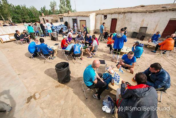 起点在村口,志愿者敲着锣鼓给我们送行,今天的路线一直沿着天山向西行,右手边是巍巍雪山,左手边是茫茫戈壁。今天一开始就要翻山,上山还好,下山就惨了,几乎没有路,到处都是骆驼刺和碎石,我领着王琦尽量拣能下脚的地方走,还好我们这次穿的是Hoka的鞋子,底很厚也很软,最适合对付这种碎石路,踩在骆驼刺上也不用担心刺到脚。下山的路我们走得非常慢,过了一会就又掉在最后面,Taka他们上山比我们快,所以领先我们不少路。下到谷底以后我经过一个村庄,村民看到我们走过都很开心,因为我们的衣服上都袖着中国的国旗,这次戈壁长征总共有来自世界各地的选手160多人,中国选手占了30多人,主场作战自然是很受观众的欢迎。过了村庄以后就开始进入一段干枯的河床,宽度有十来米,还好没水,要是这段真要涉水估计够呛。过了河床开始进入圆石滩,真不知道哪里来的这么多大大小小的石头堆在一起,我让王琦跟在我后面,他能大致看见我的脚,我踩哪里他踩哪里,这个方法比我拉着他用手杖提醒他踩的位置更加管用,危险的地方我会更加放缓速度,确认他踩稳了再往前走,前面几天配合下来我们的默契程度提高了不少,王琦也开始比较适应各种路面了,有些上下坡连正常人都很难下脚,王琦就放开绳子,趴下身子摸着石头爬过去,身手很是矫健。Taka比王琦更加困难一些,Cho和永杰两个人几乎是抬着他走过这一段,非常辛苦。前面这两段路耗费了我们非常多的时间,到cp2的时候我们已经很接近关门时间了。