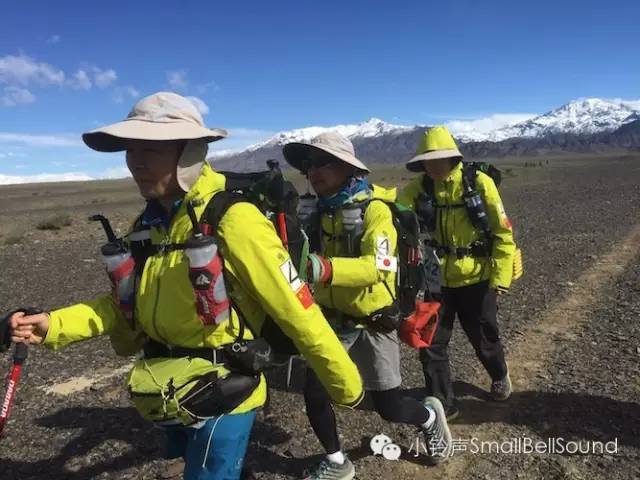 出了天山就一路缓坡下降,视野开阔,五六公里外就能远远的看到补给站,桔黄色的帐篷在黑色的戈壁中特别显眼。在CP1休息的时候又碰到了阿富汗女孩的队伍(Team Asmai),两个阿富汗女孩(Zainab 和Nelofar)和三个带领她们比赛的姑娘(Stephanie,Belinda,Virginie),Stephanie 是一位联合国的人权律师,创办了公益组织Free to Run,自己也是一位超级越野跑高手,这次和两位朋友一起帮助阿富汗女孩参加戈壁长征。女孩们拿出垫子开始向着圣地麦加开始礼拜,作为穆斯林她们每天都要在固定的时间朝拜5次,看着她们虔诚的双膝跪地朝着茫茫戈壁朝拜还是挺感动的,信仰的力量确实很伟大。阿富汗是伊斯兰国家,社会动荡,对待女性更是非常保守,女性跑步在当地是非常困难的事情,这次来参加戈壁长征也是非常不容易,来之前还因为签证问题差点不能成行。比赛过程中她们也是全程包得严严实实的,每天做礼拜,她们之前也没有很多跑步经验,比赛过程中很辛苦,Stephanie她们也催赶得比较厉害,为了让女孩们能跑起来,经常是从1喊到20让她们跑20步,然后走路,到后面几天更加跑不动了,每个补给站看到她们都是在处理脚上的水泡,膝盖也肿起好大一块,走路一瘸一拐的。今天我们有很长一段距离都是和她们前前后后的,看到她们两个弱小的女孩在另外三个强悍的姑娘催促下步履蹒跚,真是有点不忍心啊。