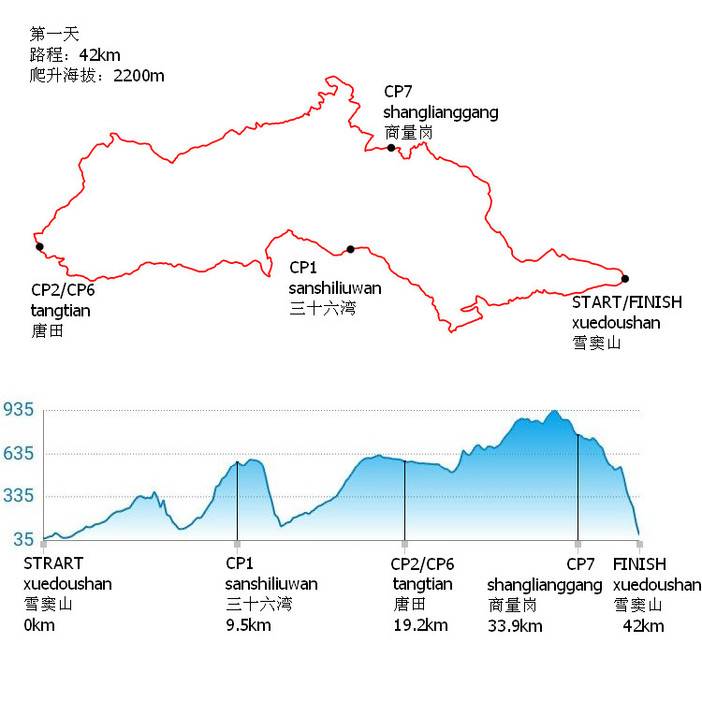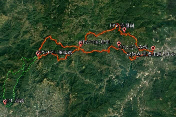 第一天起点奉化溪口雪窦山游客中心,途经CP1三十六湾村、CP2唐田、CP3董家彦、CP4商量岗,返回终点雪窦山游客中心。