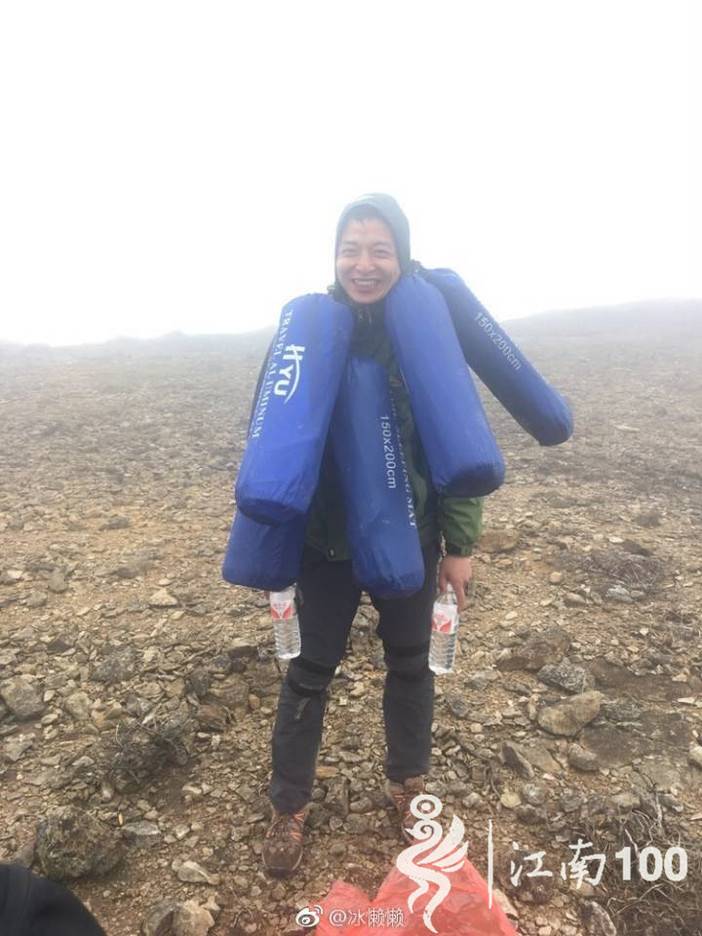 这不是摆拍,背后着45升的大包,里面装着大家的干粮,手里还提着一堆此行产生的垃圾,脖子上挂满了大家露营用的防潮垫,这都是他本次随行行走了17小时的真实情况。昨晚一夜未眠,一早又起来为大家准备早餐,他的任劳任怨吃苦耐劳大家也都看在眼里。