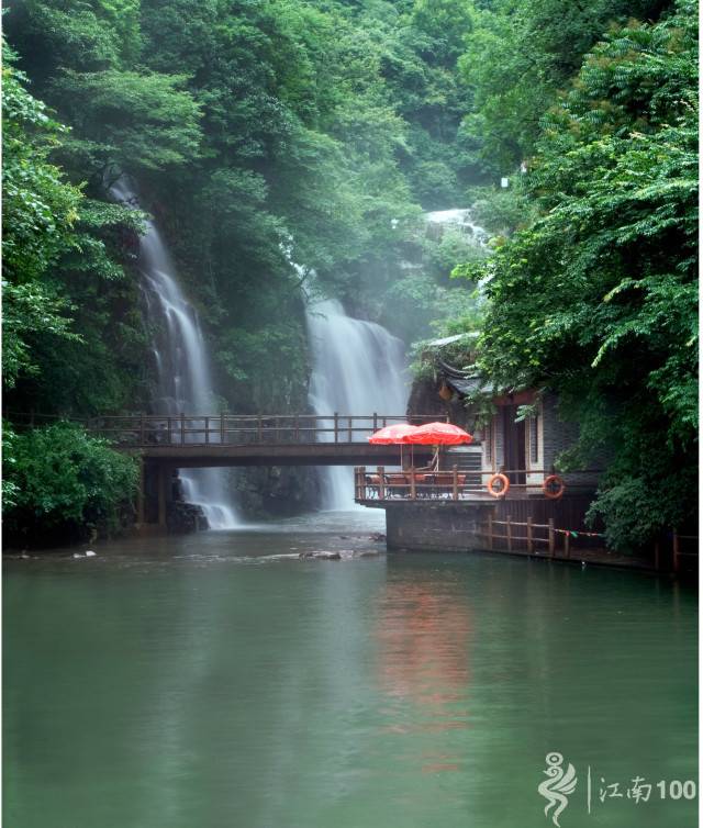 瀑两道均匀泻下,玲珑秀丽,瀑下小潭清澈可爱。
