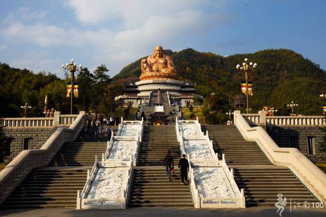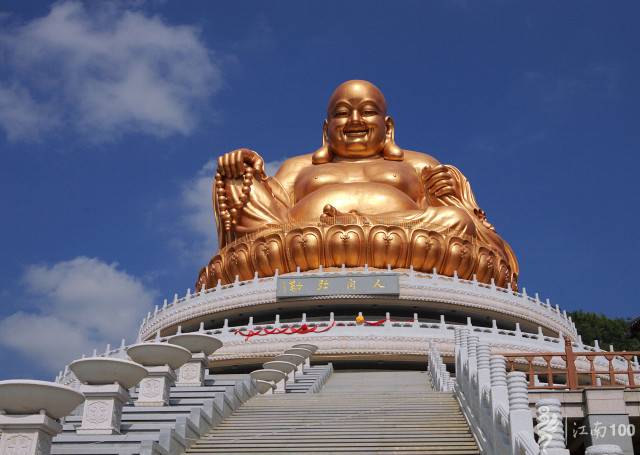弥勒大佛,共用500多吨锡青铜,浇铸成1129块铜板壁,拼装成像体。大佛面容高10.50米,溶入黄金7000克。大佛体内,用400多吨钢架结构支撑。