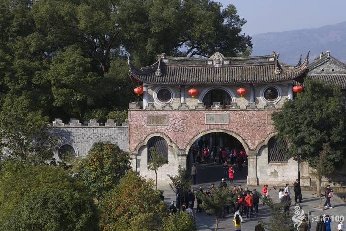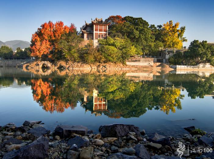 穿武岭门,往左拾级而上,两旁古樟、老松夹道迎立。武岭之巅便见拔地而起的文昌阁。它始建于清雍正年间,素为文人学士聚会之地。在这里凭槛四顾,溪光山色、参差人家尽收眼底。古代溪口十景之一“奎阁凌霄”,所指及的就是这处景观。