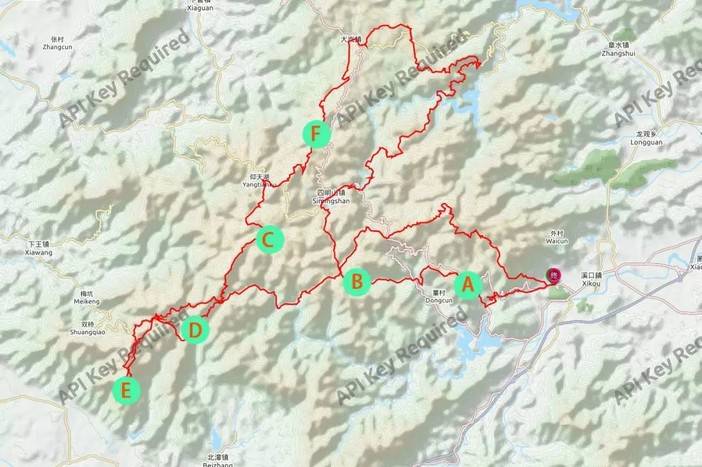 我叫小叶,2017年5月起新加入江南100团队,是今年江南之巅和明年百英里越野大赛的设计者,今天要大家分享,这条赛道的各路段技术细节,以及赛道上不能错过的经典路段。下图中这6个点ABCDEF,都是特色路段。无论你是50公里组还是168公里组,希望这篇赛道报告能给你带来收获,使你更有信心面对120天后的挑战。