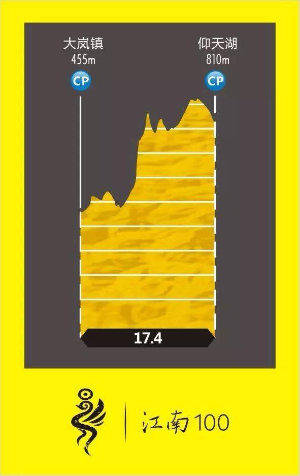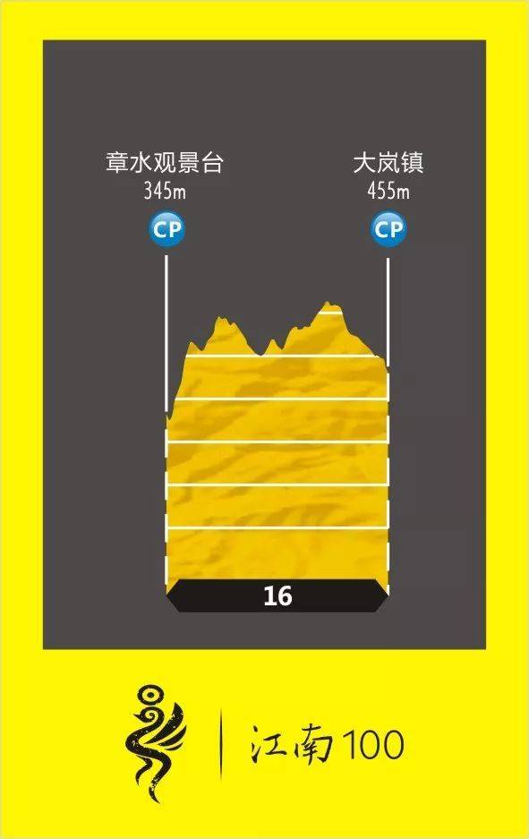 CP章水观景台——CP大岚镇。距离16公里,爬升469米,下降360米,区间限时4小时。大岚镇是一片高山台地,16公里赛道只有400多米爬升,绝大部分为非硬化的土路机耕路。起伏平缓,视野开阔,台阶为0。这一段集中体现了美式赛道的风格。主要路况:土路与机耕路90%,硬化村道10%,台阶0%。