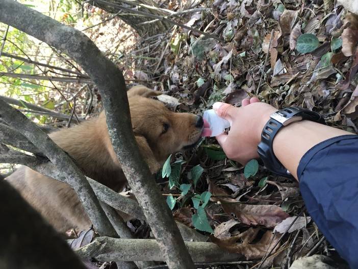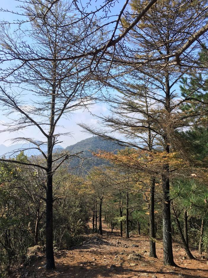 离开董家彦不久,是一段美丽的防火道,高大松树的身影映衬在四明山脉前,厚厚的松针铺满一路。这里是我们捡到赛道狗的地方,发现它的时候,小家伙在坐着晒太阳,下一秒却躲进灌木丛不肯出来,呜呜呜叫唤。才几斤重的小家伙是怎么跑到这荒郊野岭来的,饿几天了,至今都是个迷。我们把它抱下了山,并且在宁波收养着它。它与本届江南100英里赛道,就这样形成了联系。今年百英里比赛日,我们会把它带到起点和大家见面,并且它还没有名字,欢迎大家留言起名。