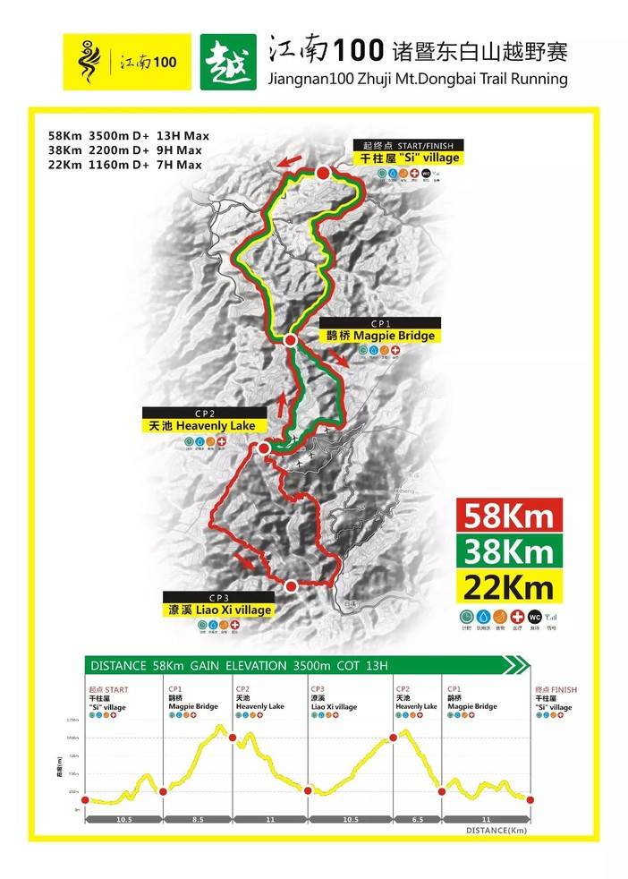 赛道路线:8字形环线,起点千柱屋——CP1鹊桥——CP2东白山顶——CP3鹊桥——终点千柱屋