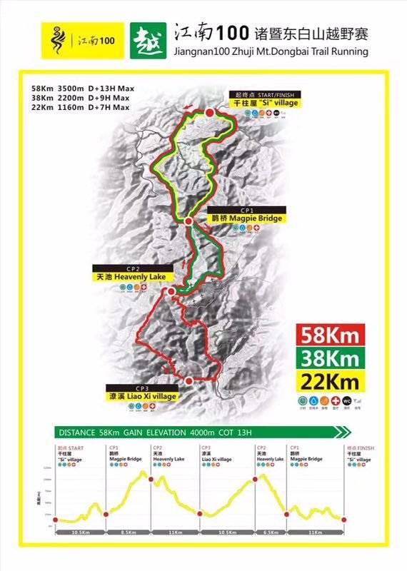 赛道距离:38公里,2200米爬升;22公里,1100米爬升,关门时间均为10.5小时