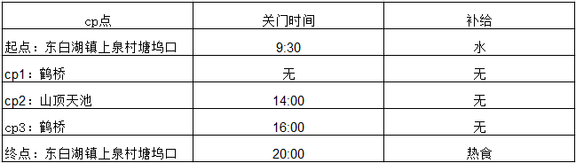 赛道路线:东白湖镇上泉村塘坞口——CP1鹊桥——CP2东白山顶——CP3鹊桥——东白湖镇上泉村塘坞口
