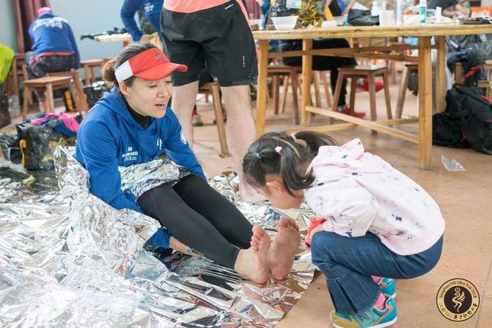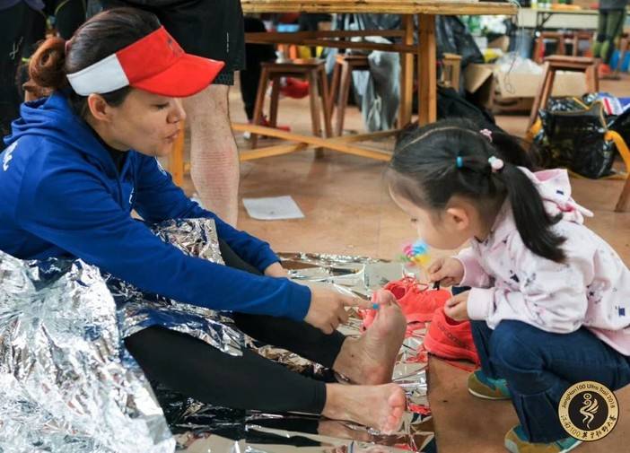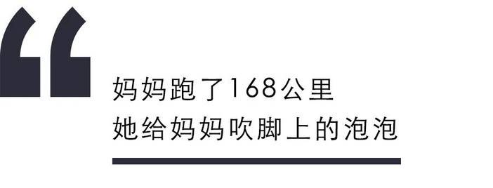 这幅场景来自江南一百的终点,百英里女子季军壁虎和她三岁女儿之间的对话。休息处的妈妈满脚水泡,疼痛不已,而小馄饨的暖心举动,却一瞬间打动了在场的所有人。