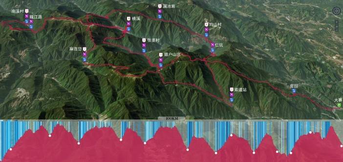 路程只有短短5公里,但爬升足足有千米,平均坡度达20%,百公里选手的淘汰赛正式开始。后半程如此密集的大爬升考验,建议在CP4横溪村就要做好充分的补给,并且随身携带自己能够吃得下的补给品,如果在CP5就开始透支体能,完赛目标就已经镜花水月。