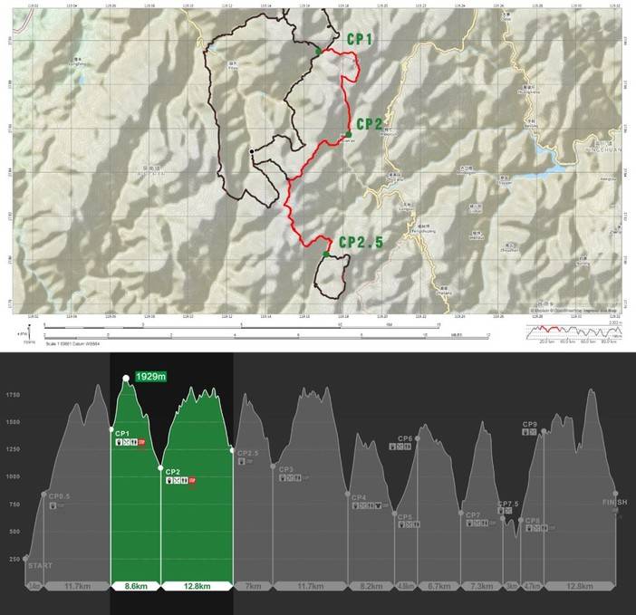 该赛段是白天与黑夜的过渡。选手抵达CP2.5如果较晚,应慎重评估自身状态并听取工作人员的建议,决定是否继续前进。如果放弃,可以沿机耕路步行1.5公里抄近路抵达CP3退赛。这一段人迹罕至,是喜爱野路选手不能错过的部分。耗费体能为1500大卡级别。难度颇高,是退赛人数最多的地点。CP3到市区,接驳车需行驶3小时(这个时间足够走完剩余赛道回到终点),且全程盘山公路,晕车的选手请慎重退赛。