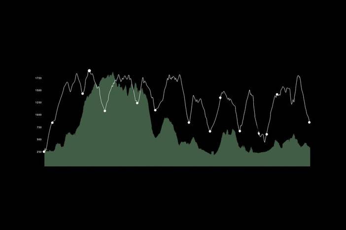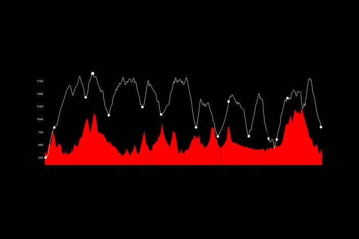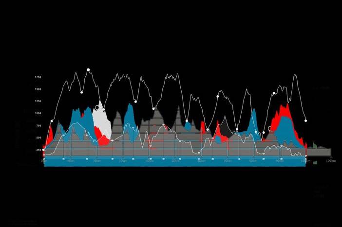 这一段是全程最难的部分,“附加题”中的“附加题”。这一段有2次上坡和2次下坡的总体态势,中间又包含着许多不太显著的起伏,因此,特别消磨体力。不仅有1段平均坡度30度以上的防火道,还有1段300米落差,几乎是垂直坠落的大下坡,终点前的最后5公里赛道是全程第一野的路段。如果这是一场游戏,那么这一赛段,就是BOSS级别的最后关卡。