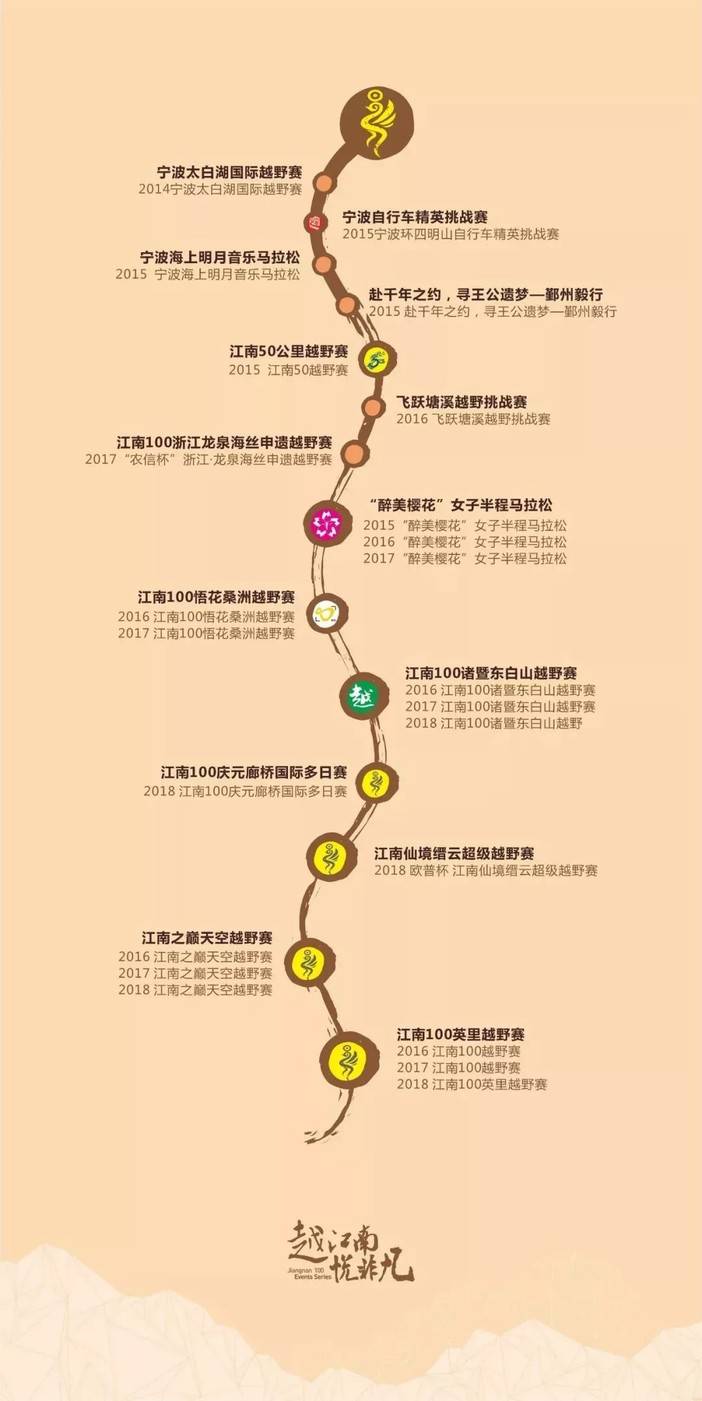 江南100体育公司(甬股交代码:781111)创立并管理的品牌江南100系列赛,旗下包括越野跑,路跑、自行车系列赛。2015年江南50越野赛作为为第一个IP赛事推出,多年深耕运营,旗下也包含江南100英里与江南之巅空越野赛等优秀赛事,其中江南之巅获2018年浙江省十佳商业赛事。公司同时也是大型户外赛事策划、执行、管理、咨询、赛事旅行提供专业服务提供商。2019开始运营日本富士山Fuji100赛事。