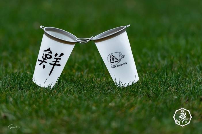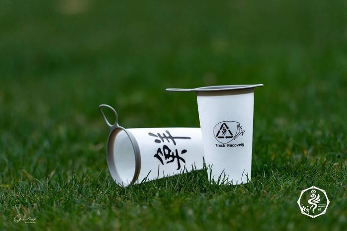 江南100赛道无痕LOGO,主图案是一个越野跑者一边奔跑一边拎着一大袋垃圾,而垃圾袋主图案上是江南100LOGO,LOGO边上是废物利用的标志,表明江南100将践行赛道无痕,收集赛道上本来要废弃的材料,清洁、处理之后再使用,减少垃圾的制造以及原料的消耗。
