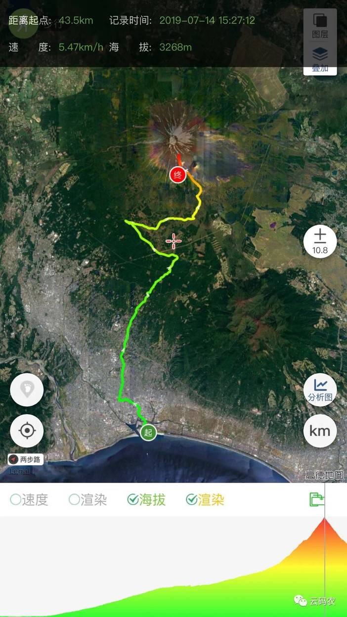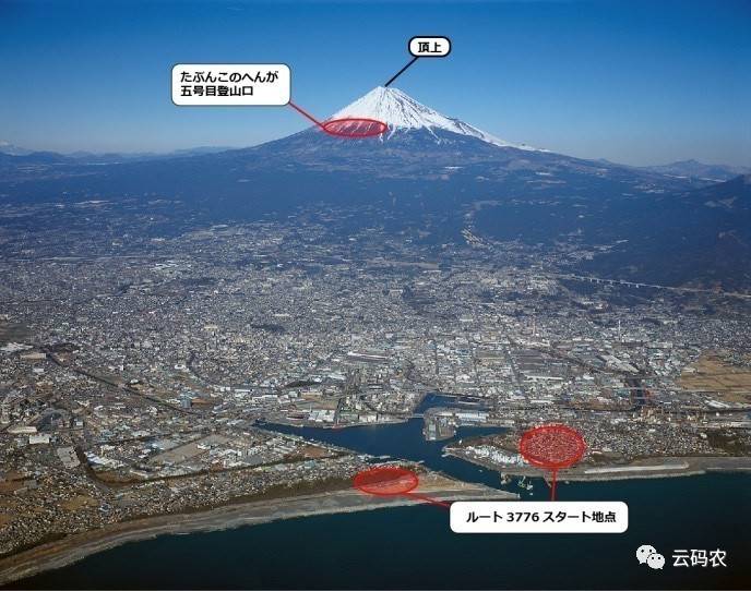 线路采用了富士市的 3776 富士山登顶挑战线路,起点在骏河湾的海滨,穿越富士市城区、山间公路、森林步道、火山岩碎石道,直至顶峰。通常要 3~4 天来完成,而越野跑仅需一天就跑完全程。