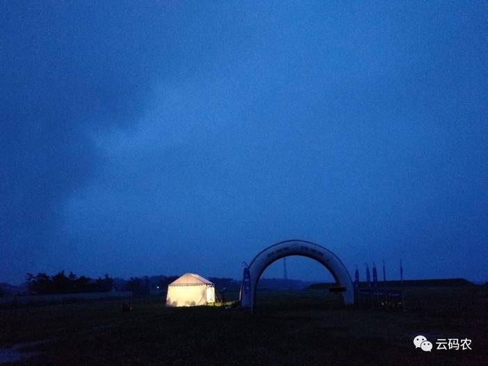 大雨还在下,四周看不见其他选手,看来是来早啦。组委会帐篷的灯还亮着