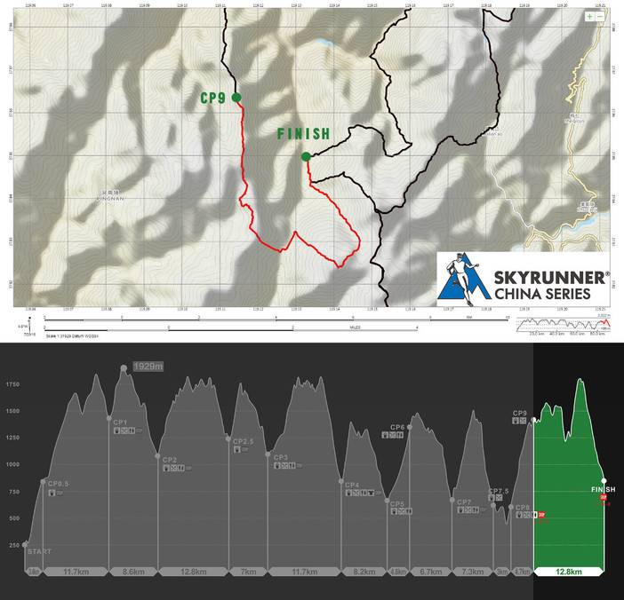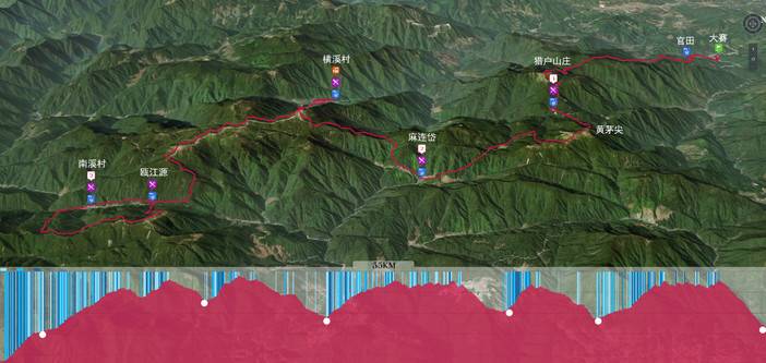 从起点到山顶,落差有1650米,比登顶泰山还多300米。植被类型从阔叶林逐渐过渡到草甸,道路从古道、千步梯、机耕路变为森林小径、碎石坡、河谷通道。赛道坡度大于30度的地段不少,其中100k在CP9后有一处近乎垂直的300米下坡会用绳索辅助,55k在CP2.5后有悬崖上坡也有扁带辅助,35k的最后4公里是980米落差的纯下坡。
