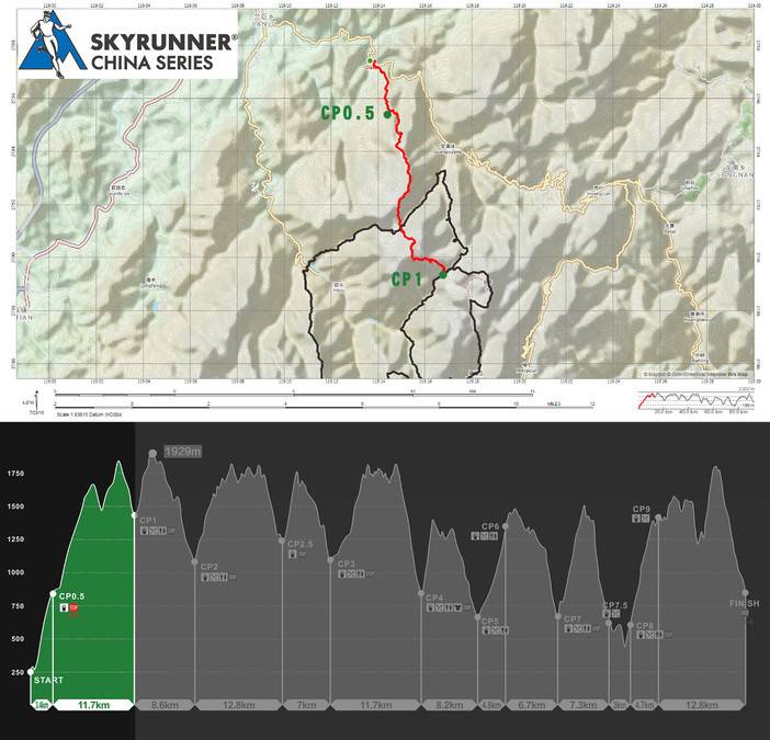 路径清晰。该段具有共有2座山(1700m、1848m),1次过河(宽度<2m,不湿鞋)。水泥路5段共约1km(平路与下坡),水泥台阶1段约0.3km(上坡,电站千步梯,坡度45°),景区石板路1段约1.4km(上下坡,1848m),机耕路约1.5km(平路及缓上坡)。大部分为林径(宽度<1m),起点为龙泉市大赛村,3.4公里处有CP0.5官田村,提供水和医疗,该点无餐饮。市区至起点,车程半小时,公路平坦。CP1位于猎户山庄度假酒店(1450m),是全程条件最好的休息点。