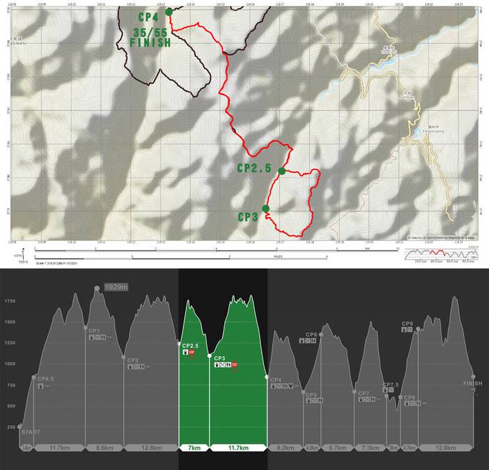 该段是全程单次爬升最大的登高赛段,约占35k总爬升的一大半、55k总爬升的三分之一、100k总爬升的六分之一。关门时间非常宽松,但需要为后面赛程争取时间。耗费体能为2000大卡级别,需重视能量的补充,建议食用香蕉、能量胶等沿途补给食品。在做好热身、调整好呼吸节奏的前提下,可逐渐提速。