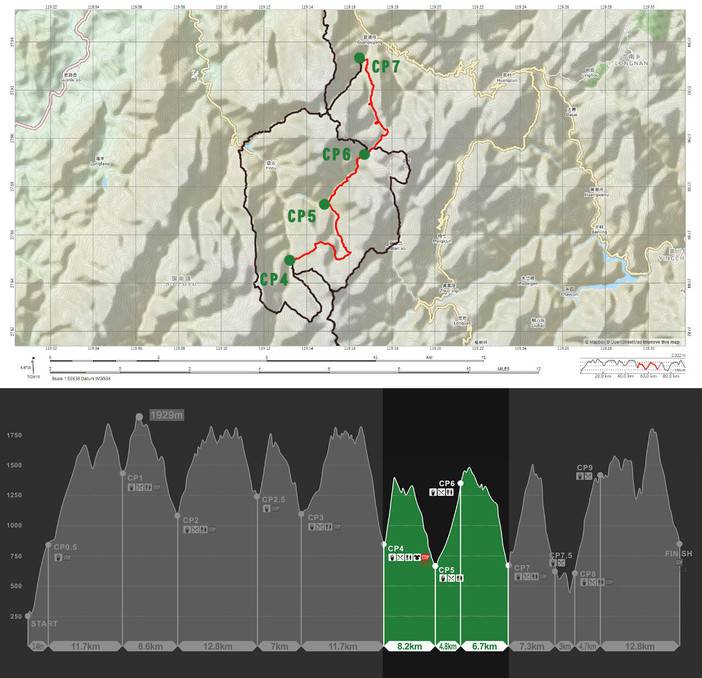 该段是全程赛道最简单的部分。登顶了浙江最高峰黄茅尖,海拔1929米,比武功山金顶还高一些,这一段可以看到天际线,风景怡人。登顶后直到CP2,全程均为下降,且以台阶为主,需要防止抽筋。由于赛道路况简单,关门时间开始收紧。耗费体能为1000大卡级别。下坡可尽量提速。