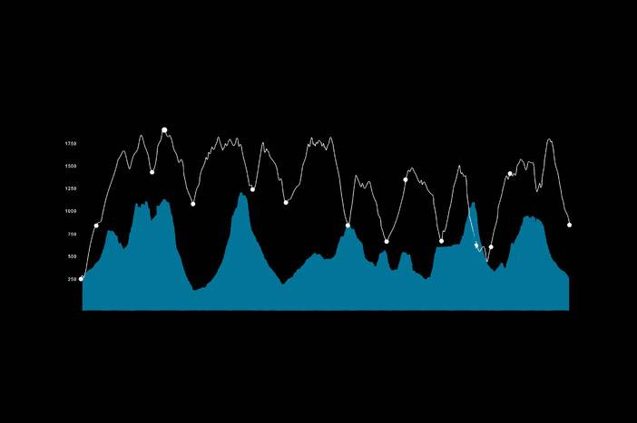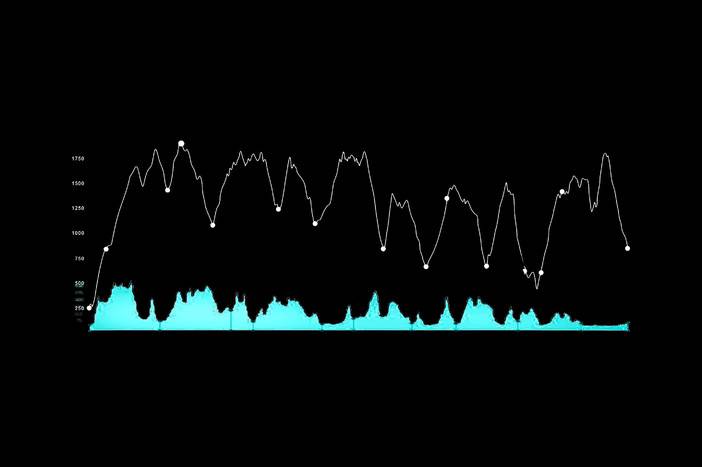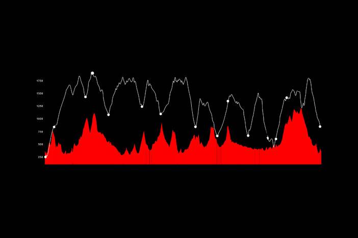 没有悬念的再一次持续爬升、持续下降,在爬升图上画出一个A字形。这一段地形非常复杂,在大的爬升下降态势中还包含着许多上下坡。能够在这一段得到A级的挑战者,毫无疑问是高手中的高手。如果没有分配好全程的体能,或者在意志上发生了动摇,对于大部分参赛者而言,CP8,可能就是终点。