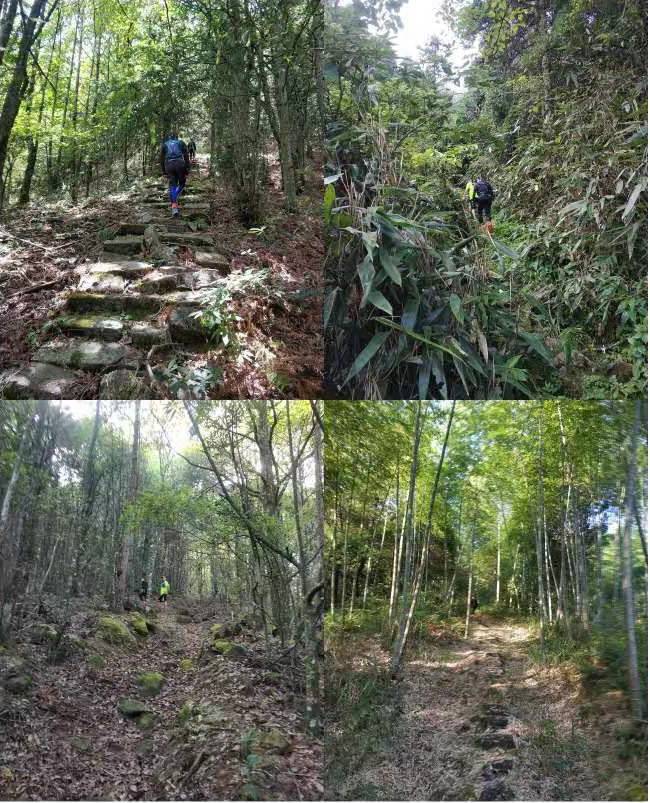 随后的凤阳尖,路不熟,走错一段竹林野坡,气喘吁吁手脚并用一百多米爬升,以为最陡,结果女神告知,这真不是最陡,顿时心里“凉”了一下。随后凤阳尖一路上山,感觉尚可,因为也是一段陡一段缓的爬升,这个大家心理上都喜欢,毕竟能迅速恢复过来。但从猎户山庄出来,前往黄茅尖,一路古道台阶上坡,持续上坡爬升越来越长,幸亏有过去年东白5公里900米爬升台阶上坡拉练的经验,才能勉强跟上撸铁女神怡君轻松的步伐。