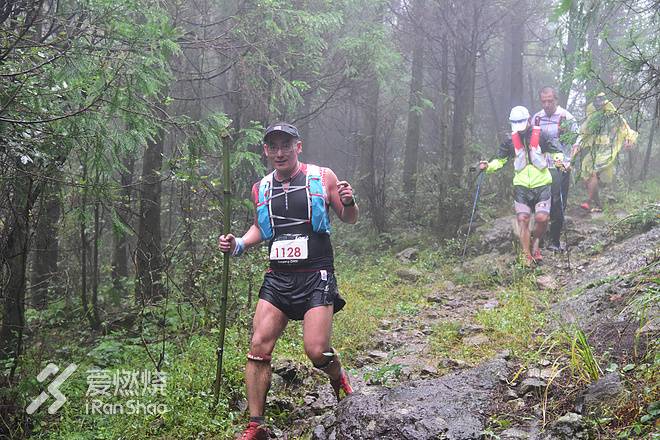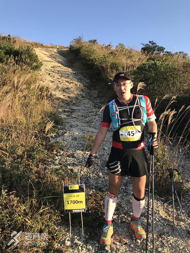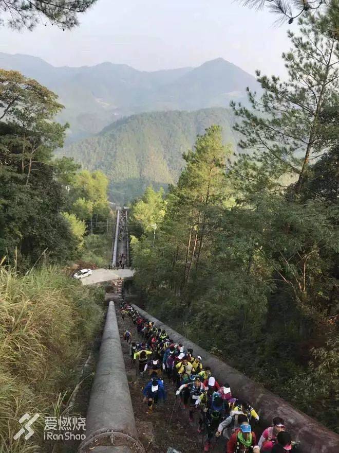 一夜无事。周日早上坐组委会大巴来到赛事起点大赛村(好应景的村名),人已经很多了。深秋的清晨已经比较凉了,大多数选手都是长袖长裤;有宁海的前车之鉴我不敢再大意,穿着CS的飓风皮肤衣出发。跟爬升图所描述的一致,几乎一起跑几百米就开始爬升,一口气要爬到海拔1600左右;不由得让人思之立刻两腿灌满乳酸。一开始是一段非常长的台阶路,然后转入到竹林里进入很陡峭的龙庆古道;龙庆古道是浙闽古道的一段,古时山民在此陡路上跋山涉水为了生计而奔波,他们肯定不曾想很多年后一群衣着光鲜吃饱饭没事干的疯子们踏着他们的足迹用奔跑来找虐。两段时光在同一空间交错,不变的是挺拔劲秀的竹林和脚下松软的带着香气的泥土;谁知道,若干年之后的后来者们将会在这条古道上演绎怎样更精彩更疯狂的故事呢?当听到喧天的锣鼓声和人群大喊“加油”声的时候,从竹林跳跃到一条山间马路之上,这里便是SP1了。从起点到SP1,以及后面的每个SP和CP,都能见到很多来帮忙服务或为选手助威的本地乡民百姓们,可见本地政府对江南之巅的重视程度;事实上,他们也都是非常热情、善良的,这为这场充满虐的越野赛增添了很多人文关怀,这也是越野赛事的应有之义;不禁再为UTNH和江南100点个赞。SP1之后赛道转入满是参天大树的原始森林之中,山势稍缓但仍然在不断爬升;道路是非常松软的落叶层积小径,平缓的地方可以跑起来。当你抬头仰望的时候,看不到树梢在哪里,也看不到蓝天,只有一条条早晨温暖的阳光穿过树叶和枝干,洒落在我们花花绿绿的衣服上。这一段非常惬意,让我想起来小时候在老家大山里行走的感觉,只是少了风从山上掠过带来的阵阵松涛之声。