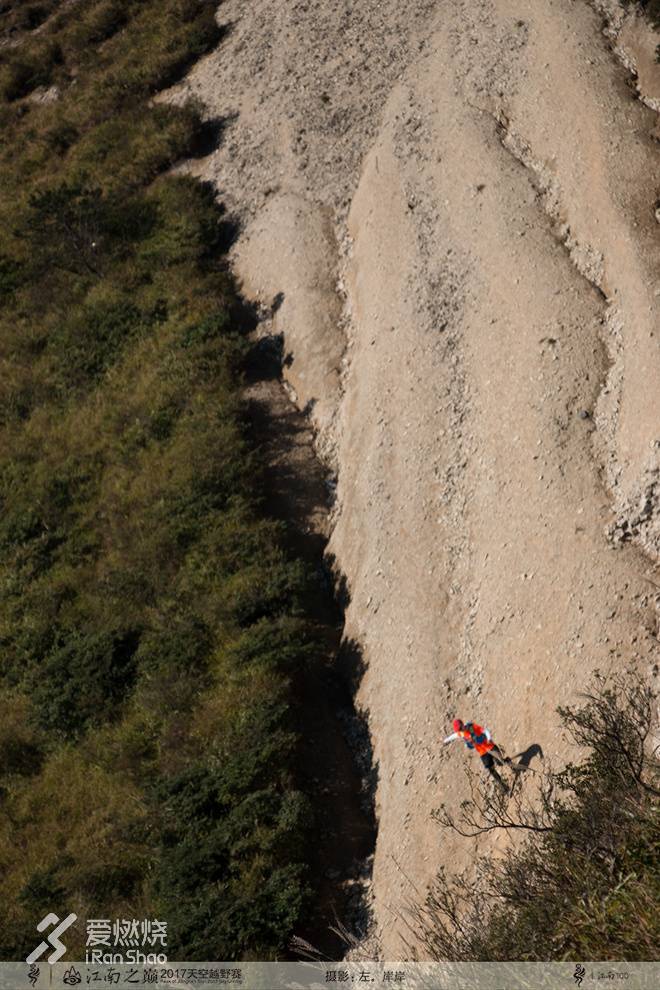 赛前看组委会推文中这样写道:“当行程累计到36km,累计爬升累计到近3700米,SP2瓯江源/锅帽尖就在眼前,这里是经过学术考证的真正瓯江源头,而精英组选手要通过的,是源头身后,全程最难的一段赛道——海拔1770米的锅帽尖,这一段赛道我们将难度标注为,不是没有道理,几乎没有徒步者能够从瓯江源出发直接登上锅帽尖,每位选手都将是这一不凡挑战的创始者之一,并且锅帽尖上的防火道相当陡峭,很多路段达到了锐角的60度坡度,下坡几乎全部是屁降坡。”这里“几乎没有”把人唬住了,那它到底是条什么样的路呀?从爬升图上并不能看出这么唬人的意思呀!武功山的时候也是,如果只看爬升图那是轻松愉快的,可真正踏上那条路真是要哭了。爬锅帽尖这段路,根本就不是路!事后和农民沟通也被他证实,这段线路是他们开出来的;所以路上总能看到被镰刀整理过的枝蔓。在SP2出来的时候我和一位来自永康的大姐同行,她已年过四十但非常矫健,是全马33X的好手。果然爬这段路的时候她也毫不逊色于我们几个大男人,甚至我们这一行七八个人中是她第一个站到锅帽尖顶上的,不得不佩服。这里还有一个不得不说的事情是,路上有两处很危险的峭壁,大约三四米宽,要靠手拉着组委会搭建的安全绳才能攀爬通过;如果不小心失手或安全绳出问题,后果将会极其严重。这也是我们再次折返到SP2时竭力劝还未上锅帽尖的选手们弃赛的主要原因,实在难而且险。