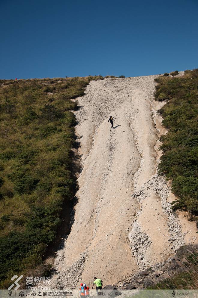从CP2到烧香岩5公里路程要爬升800米;赛前组委会的各种推文和视频渲染之下,我已经为这段路准备好了被虐致死;同时这段路也是赛中赛的速攀赛段,不知道夜戈小伙能不能一口气直接飞上去。好走的路都已经走完了,从此往后的赛段基本上没有了森林和灌木丛小径;取而代之的是一段又一段无穷无尽的碎石坡。路面很宽,但没有一米是好走的,所以不管你选择什么样的路径抑或干脆之字行走;难爬是一定的。有几个碎石坡陡到足有45度以上,甚至站在坡底抬头都看不到顶在哪里;幸好今天带了杖,否则我真要毫不优雅地四脚并用才能爬上去。烧香岩上就是CP3,但这里并没有任何补给,只有打卡计时;35K组的伙计们可以不去大天堂就准备下山去往终点了,而我们55K组的疯子们还得继续往大天堂而去。去往大天堂的道路倒没有很大的爬升和下降了,但是感觉有数不清的碎石坡循环播放着,上上下下的感觉真是让人迷醉了。此时时间已经过去了7个多小时,但我还没有碰到任何一个折返的55K大神,看来大家赛前预测的冠军7个半小时完赛是不靠谱的;相比通常50K越野赛5小时左右的冠军成绩,江南之巅之难可见一斑。通过大天堂的时候,一位志愿者告诉我们,确实还没有选手折返经过这里,第一梯队是在将近4小时前通过这里的。听到这话,我不由得想哭了,因为简单加法算一下就知道,对我来说至少13小时完赛是完全不可能了;再想到,这段如此虐的赛道,我们还要折返再搞一次,我就真的吓哭了。