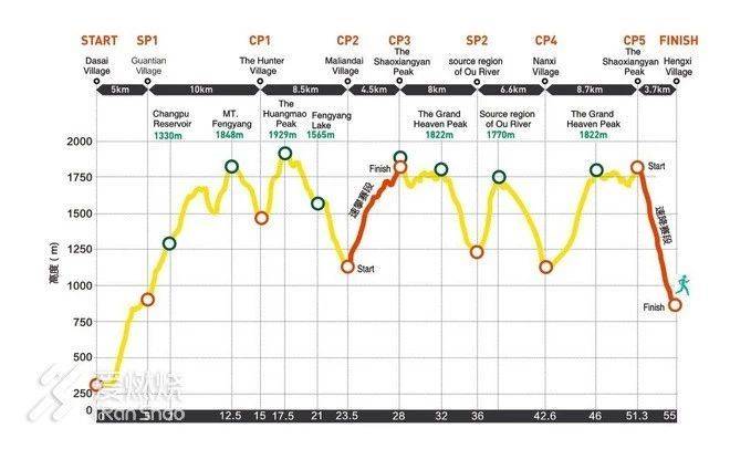 出站立刻又开始爬升,一口气要登上“江浙第一高峰”--黄茅尖,海拔1929米。攀登高峰的道路总是相似的,反正就是累啊虐啊气喘吁吁啊,喘着喘着就爬到顶上了。所有选手到这里都会忍不住在题字巨石下咔嚓几张照片,以便日后向人吹牛B的时候有图有真相。才登绝顶又要翻下谷底,从黄茅尖要一路狂奔下降900多米(中间夹杂累计600多米的爬升)直到CP2麻连岱。这一段路非常好走,大多数是景区的台阶路以及村民们日常上山劳作的平坦小径;乘着膝盖还没有粉碎,我也加了一些速度,大部分都可以用5分到6分的配速直奔而下。路上还遇到零零散散的徒步驴友,其实我觉得千八比武功山更加成熟更加漂亮更有野趣,也更适合重装穿越或山顶扎营;可是为何没见到像武功山那么多人呢?我愿为千八带盐,嘿嘿。中间在海拔1565米的时候会经过一池碧水,就是凤阳湖了,旁边立着的木牌上写有“小天池”,确实恰如其名。可惜不知为何,湖水并不清澈所以也不知其深浅,否则真有跳下去洗个澡的冲动;即便如此,半山腰中镶嵌一块宝镜,也是可以入画的景致了。这个时候我觉得奇怪的事情是,我的前后左右看不到任何一名选手了,要不是遍布的黄丝带路标点缀四周,我都会怀疑自己跑岔路了。可能大神们都早已走远,而跑渣们还在绿野山庄和黄茅尖流连咔嚓吧;这么说咱算是非神非渣的中等偏上选手啦,很满足!阿Q精神鼓舞着我继续快马加鞭,一边跳跃奔跑一边想着,要是有人拿运动相机跟拍我,那肯定是极帅的。终于在快到CP2麻连岱的时候追上一位成都兄弟,从此往后我们俩就一直犬牙交错左右伴随着直到完赛,不表。
