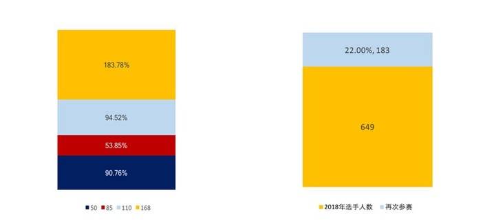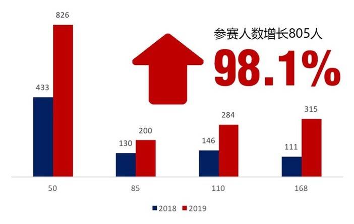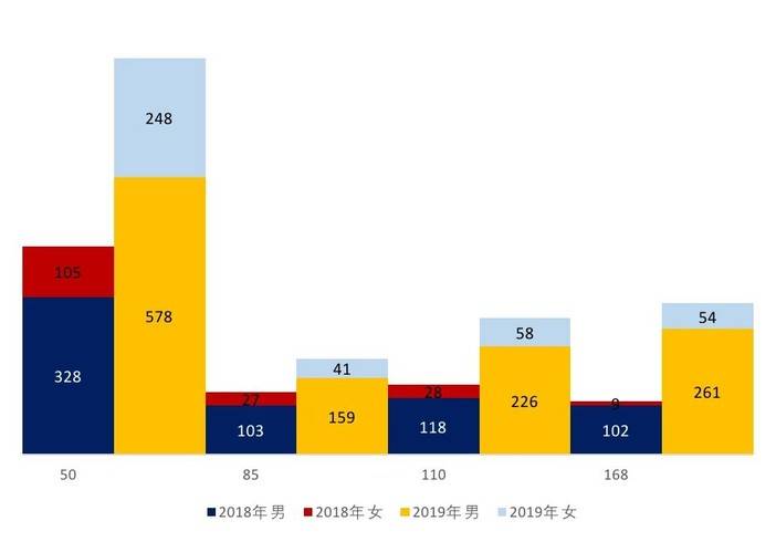 2019年,各组别参赛人数较去年均有不同程度的增长,50公里组别参赛人数增长近一倍,而168公里组别,增幅高达183.78%,接近于去年赛事参赛人数的两倍,参赛人数已突破300人。