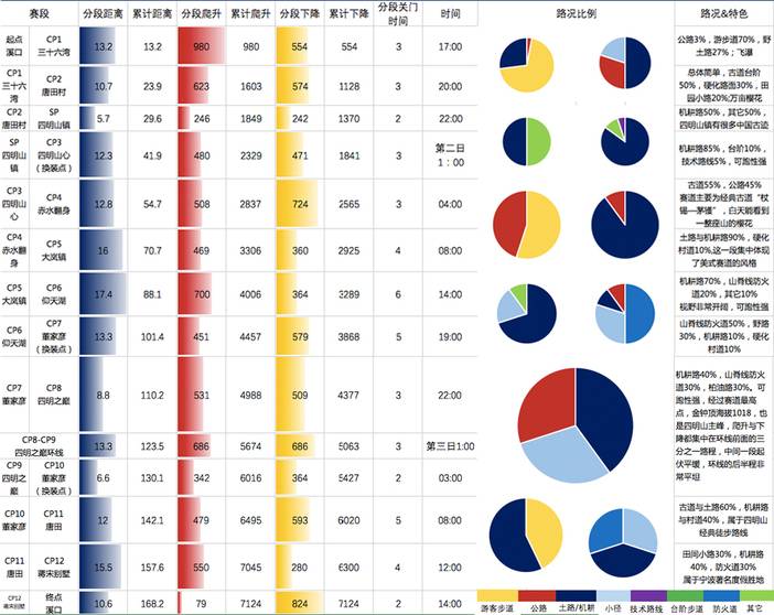 上图为2019年江南百英里168组别分段距离与路况比例数据(因文字较小,可单击放大浏览)。众所周知,与距离相比,爬升才是决定越野跑难度的胜负手。从图中可以看到,赛事累计爬升7124米,共包含14个赛段,单段爬升超过600米的赛段为4个,最大的单段爬升出现在起点至CP1,所有选手体力最充沛、斗志最旺盛之时;在70.7的CP5时,将会面对第二大单段爬升,数据为700米;其余均为600米及以下。