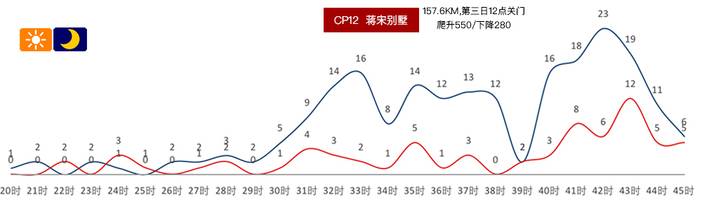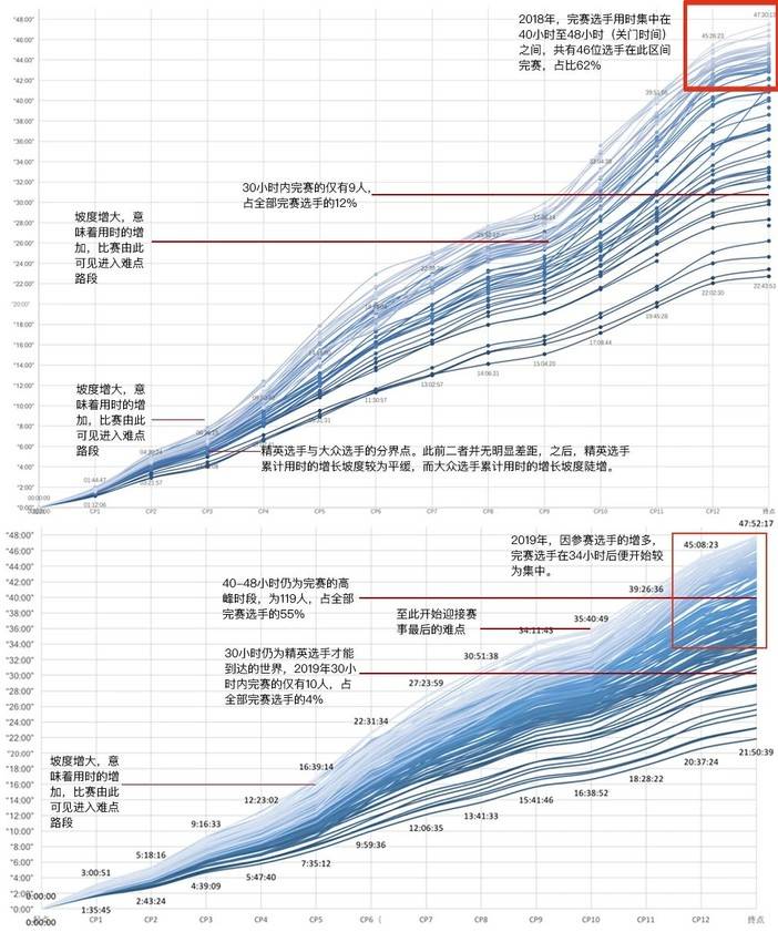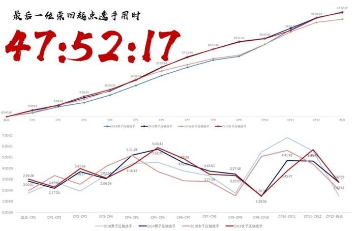 对于绝大多数选手而言,冠军选手也好、精英也罢,与己无关,只求安全顺利完赛即可。上图为2018/19年,压轴完赛选手的累计用时与分段用时。耗时最久赛段为CP5-6,用时5小时52分,近6小时;耗时第二久赛段为CP4-5,耗时5小时11分;其次为CP10-12,耗时均接近5小时。其余各赛段平均用时多为3-4小时。完赛无需计较一时快慢,重要的是不断的保持前进,不退缩、不畏惧,意志坚定。同时,要在CP6-9赛段适当保留体力,迎接最后的CP10-12阶段大考。抵达CP12便意味着比赛的成功。