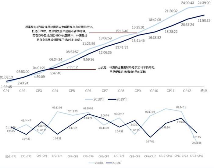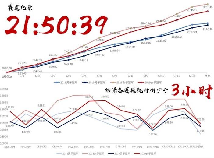 上图为林潇2018/2019年两次参赛的累计用时与分段用时对比。林潇2018年首次参赛,以24小时39分的成绩夺得第二名;2019年,林潇再度归来,重新回到熟悉的起点,这次他再没有给任何对手机会,以21小时50分的成绩刷新赛道记录,夺得冠军。将自己的完赛成绩提高近三小时。明年,是否会产生新的赛道记录,再次刷新我们的认知,让我们拭目以待。