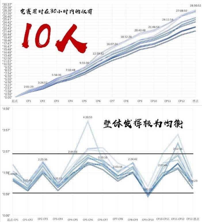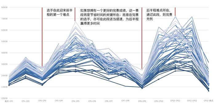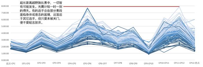 到达各CP点用时虽互有上下,但基本线条的走势保持了一致。可见,在赛道相对保持稳定的情况下,大部分选手的发挥并无太大差别。往届选手的发挥及用时,可以作为制定将来完赛策略的重要参考。