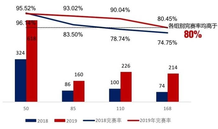 2018年,在遭遇连续降雨的恶劣天气下,168组别完赛率仍高达74.75%,而今年完赛率则上升至80.45%,其余组别完赛率均已突破90%。