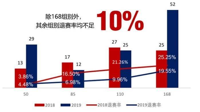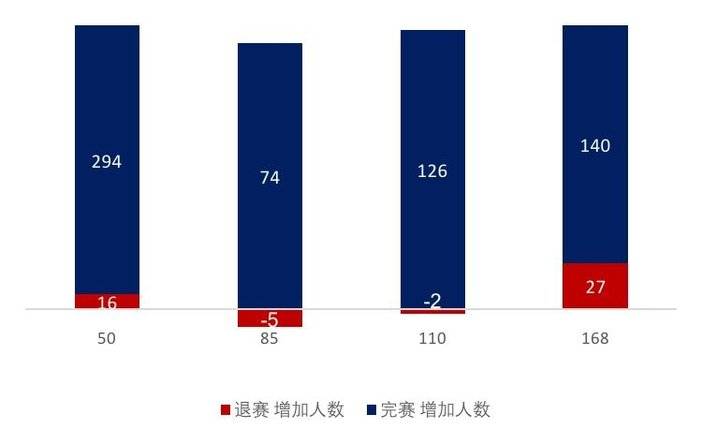 168组别2018年退赛率接近四分之一,而今年已降至不到五分之一。85及110公里组别的退赛率亦呈现下降态势。
